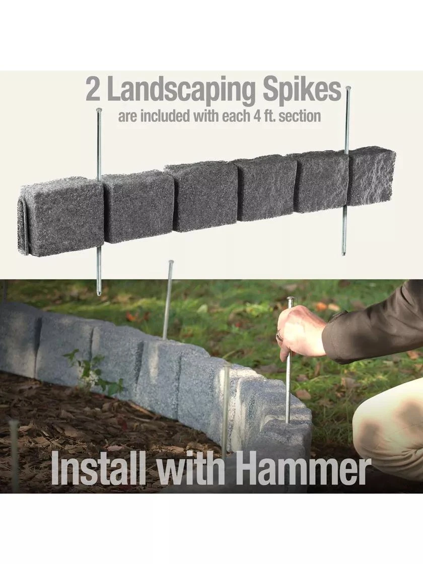 Made in the USA. These faux stone blocks are flexible, connectable and very sturdy! Rust, fade and corrosion-resistant they are commonly installed around trees, swing sets, along gardens, walkways and driveways to organize, beautify and enhance your outdoor environment. The easy-to-use, ‘slide-on/slide-off’ connection system allows anyone to install.