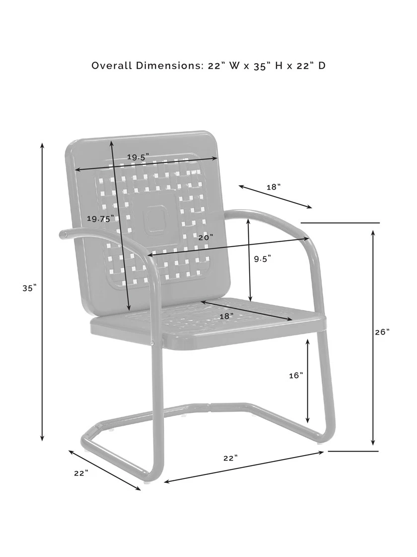Nostalgia abounds with the Bates 5pc Dining Set. Four vintage styled chairs in vibrant colors surround a simple metal dining table for a fun and functional outdoor dining experience. Each chair features a square back with a unique basket weave design that allows air to circulate, adding to the comfort of the seat. With a cantilever base, the chairs offer just enough flex for relaxed al fresco dining.