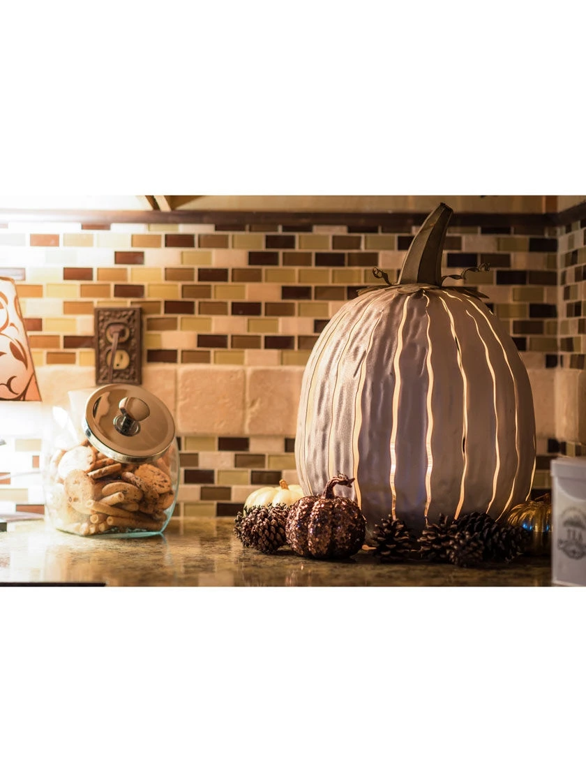 Let this striking Pumpkin Luminary be the center of attention throughout the season. Place a light or a candle beneath it to see the glowing striations and add warmth to those autumn evenings. This maintenance free adornment is perfect for any walkway or patio. Powder-coated steel construction for all-weather, rust-proof, and fade-resistant durability. For indoor or outdoor use. There is a large 6” opening for a candle or light placement (candle/light not included). Use a flameless candle or 3-wick jar candle for best results.